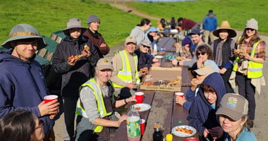A stainless steel bowl that someone set out for dogs under the faucet in a picnic area served as a watering hole for dozens of Western Yellowjackets on one of our hot days in early September. I was holding the spring-loaded faucet open with a 300-foot hose attached while Bob Huttar and Carlene Chang were watering the native plants on the other side of the ridge, and I happened to glance down at the water dish and saw the wasps. The yellowjackets had no trouble walking up and down the polished vertical stainless steel sides of the bowl. I thought that was pretty amazing. I couldn’t see exactly by what means they took the water in, but they pumped energetically, flexing their abdomens rapidly. Sometimes a wasp would land in the water and drink from there. It had no trouble flying off again. I was inches away but none of the bugs bothered me.