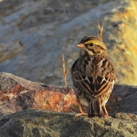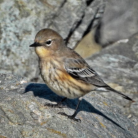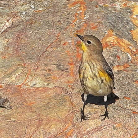 A byproduct of scanning the rocks for Burrowing Owls was this encounter with the pretty Yellow-rumped Warbler in its winter plumage. They hopped around on the rip-rap and flitted in the Fennel bushes.