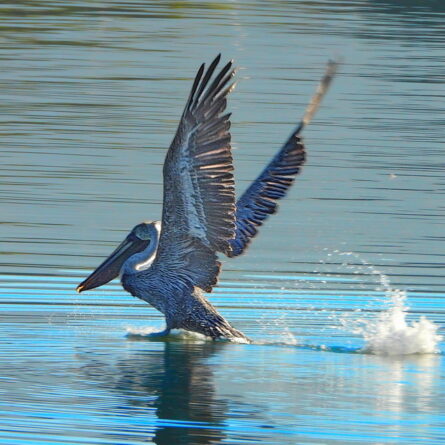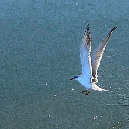 The Brown Pelicans were putting on a diving show Sunday morning (see these snippets on YouTube), and a trio of Forster’s Terns added their acrobatics. While my camera could often keep up with the stately motion of the big birds, catching the swift terns proved frustrating. When I got the pictures home, I saw that a tern had flown into my picture of the pelican, without my being aware of it at the time. Photographer’s luck! Later I managed to get another snapshot of a tern purely by pointing the camera in the general direction of the streaking bird and holding the shutter button down. It’s not high art but sometimes it works. One good tern …