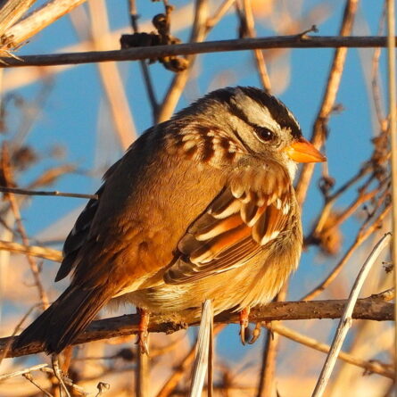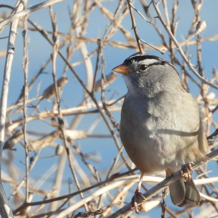 After weeks of hearing but not seeing them, I was finally able to get some better pictures of the migrant White-crowned Sparrows. These are amazing birds, able to fly thousands of miles from their nests in the Arctic to our park, relying in part on their sense of the earth’s magnetic field. We also have a small population of year-round residents, the Nuttall’s subspecies, that mostly show themselves in the Native Plant Area. I saw their migrant siblings mostly toward the shoreline.
