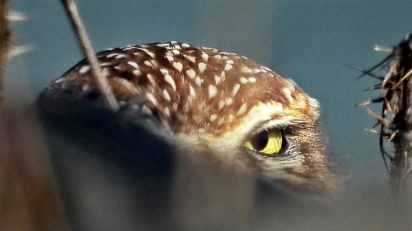 This morning (Monday 10/28) a Burrowing Owl perched so low in Perch B that I had trouble digging it out even with my telephoto lens. This is the most I saw from the paved trail outside the fence: