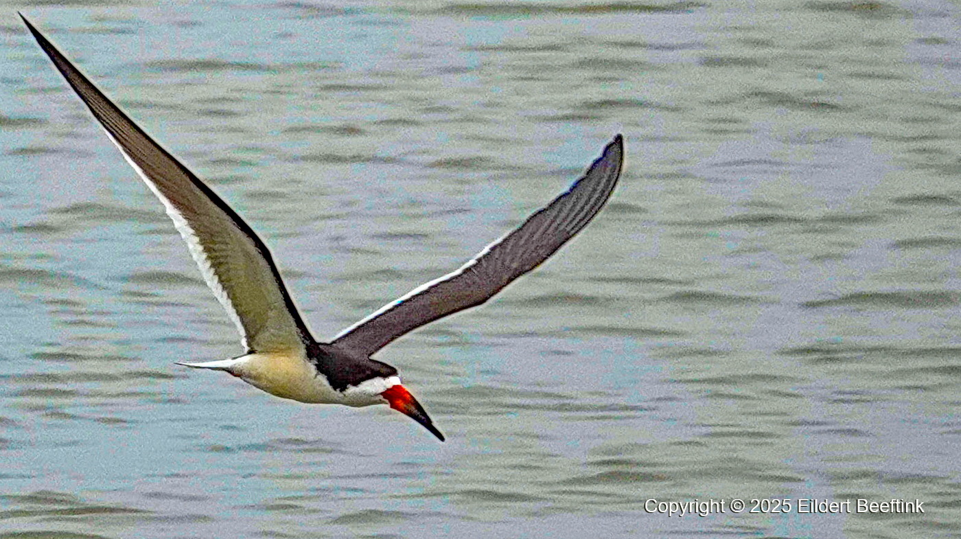 These birds have an amazing foraging method. Using their ample wings for stability, they glide over the water with their open bill slicing the surface. When their lower mandible encounters a little fish, the top of the bill snaps shut instantly, capturing the prey. They can even do it in darkness. No other bird does this. They have been seen here and further north off the Richmond coast for several months. I hope one day to get a photo of them in operation, maybe with a fish in beak. Congratulations and thanks to Eildert for snapping this fast-moving bird in flight.