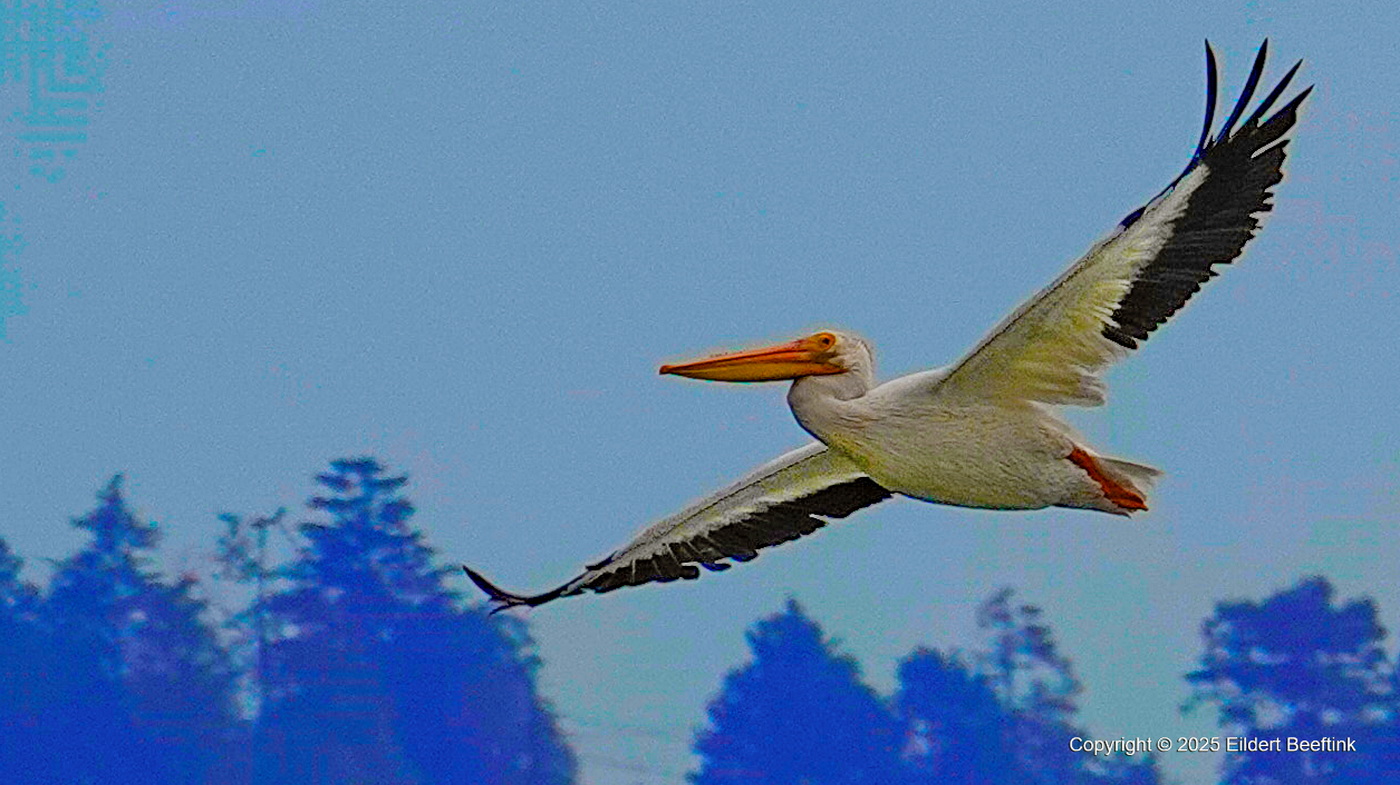 A small flock of American White Pelicans visited the North Basin on August 12, and ace photographer Eildert Beeftink was on the scene and captured this fabulous image. These are majestic birds, with wing spans of eight to ten feet. They are known for cooperative foraging, making a semicircle to drive fish to shallow water where they can be more easily scooped up in the birds’ giant bills. Eildert also got two other photos of these birds in flight: