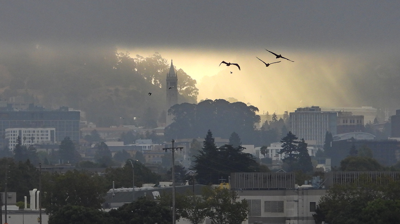 Looking east, with the morning sun squeezing under a ceiling of fog, outlining the Campanile and surrounding UC campus buildings; Pelicans in the air.
