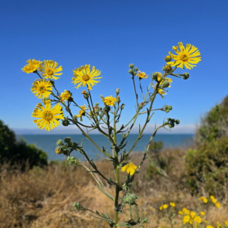 Jaumea is a perennial and spreads via underground rhizomes. The dense web of these fibers helps stabilize shoreline soils. In spring it blossoms with small daisy-like yellow flowers that attract butterflies and other pollinator insects.