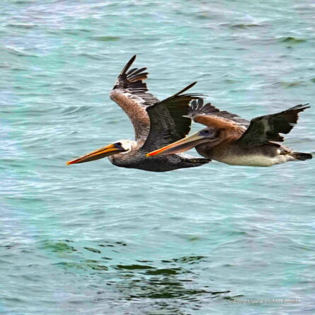 A small flock of American White Pelicans visited the North Basin on August 12, and ace photographer Eildert Beeftink was on the scene and captured this fabulous image. These are majestic birds, with wing spans of eight to ten feet. They are known for cooperative foraging, making a semicircle to drive fish to shallow water where they can be more easily scooped up in the birds’ giant bills. Eildert also got two other photos of these birds in flight:
