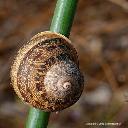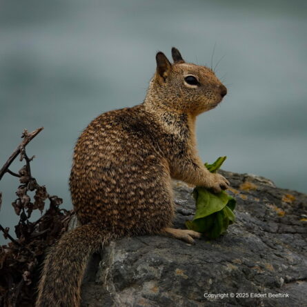 This California Ground Squirrel pup held still for its portrait, showing off the handsome light speckles on its furry coat. The young ones tend to be rather skittish, more so than their experienced elders, and it’s often a challenge to get them to hold still long enough for the camera to frame and focus. Much more cooperative is the garden snail, shown here having a rest on its way up a Fennel stalk.